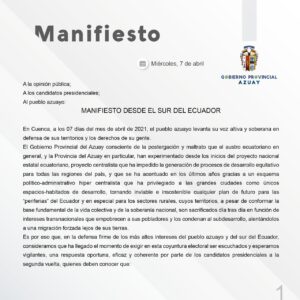 La Prefectura del Azuay, en Sesión Extraordinaria de Cámara Provincial efectuada este miércoles 07 de abril del 2021, aprobó por unanimidad el “Manifiesto desde el Sur del Ecuador”, en el cual se detallan las diversas contribuciones que ha aportado el territorio azuayo para el desarrollo del país, sin contar con la reciprocidad de las autoridades nacionales para con los habitantes de la provincia.