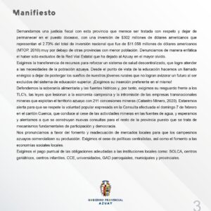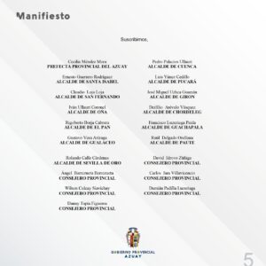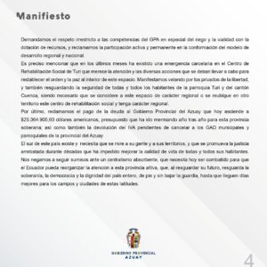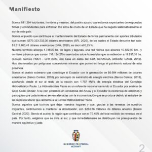Por su parte, la Prefecta del Azuay, en sus declaraciones, expresó que “es un manifiesto que engloba a las necesidades azuayas en sus distintos campos: salud, educación, vialidad. La necesidad a las reformas necesarias del SRI, el apoyo para nuestros productores campesinos y el sostenimiento de la economía campesina que nos permite una producción que está orientada hacia el interior y la alimentación de los ciudadanos y las ciudadanas de la provincia”, subrayó.
